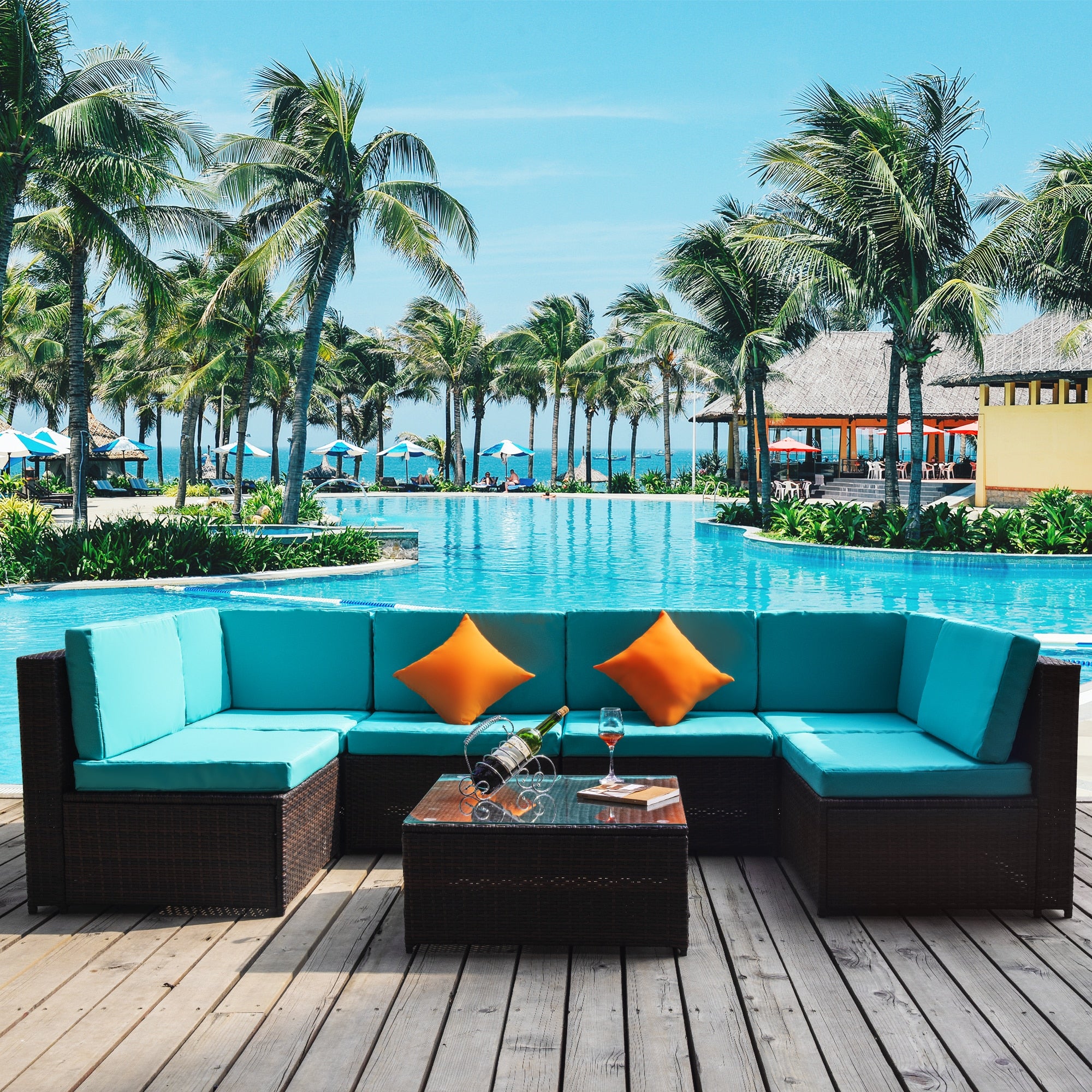 7Pcs/set Patio Sofa Set Free Cuhion As Gift Furniture Couch Puff Home Use Rattan weave Linen Hemp Fabric Shape U Swimming Pool